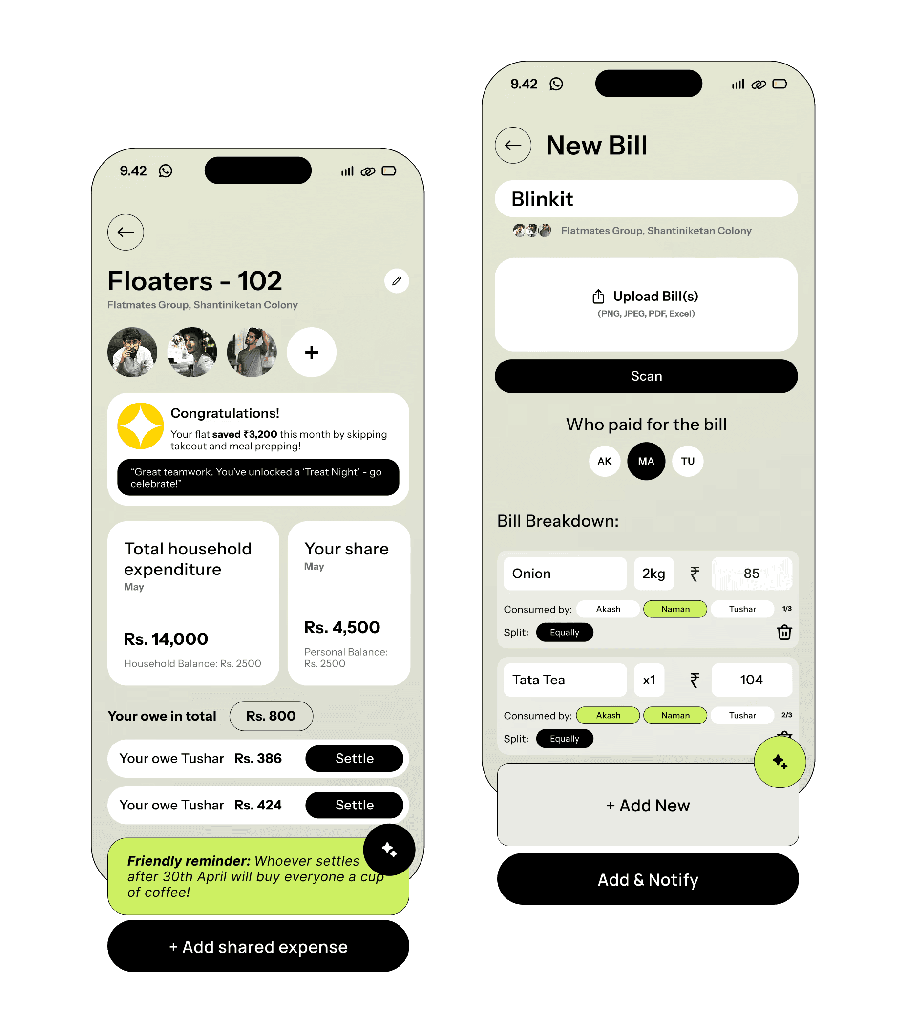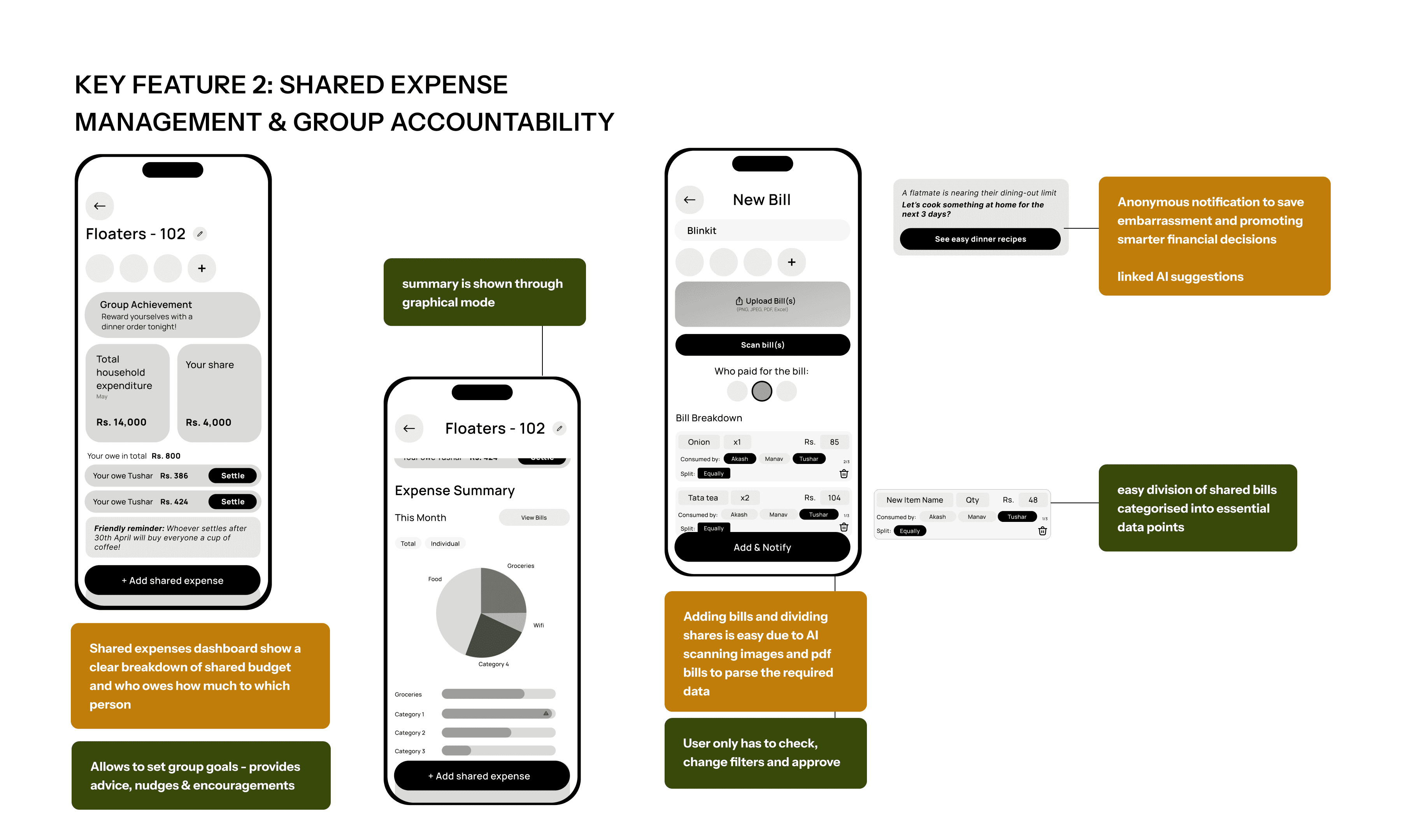 I designed an app that makes flatmate budgeting transparent, fair, and fun. It auto-tracks behaviours and uses AI to scan bills for instant splitting, with positive nudges that make flatmate budgeting transparent, fair, and stress-free.